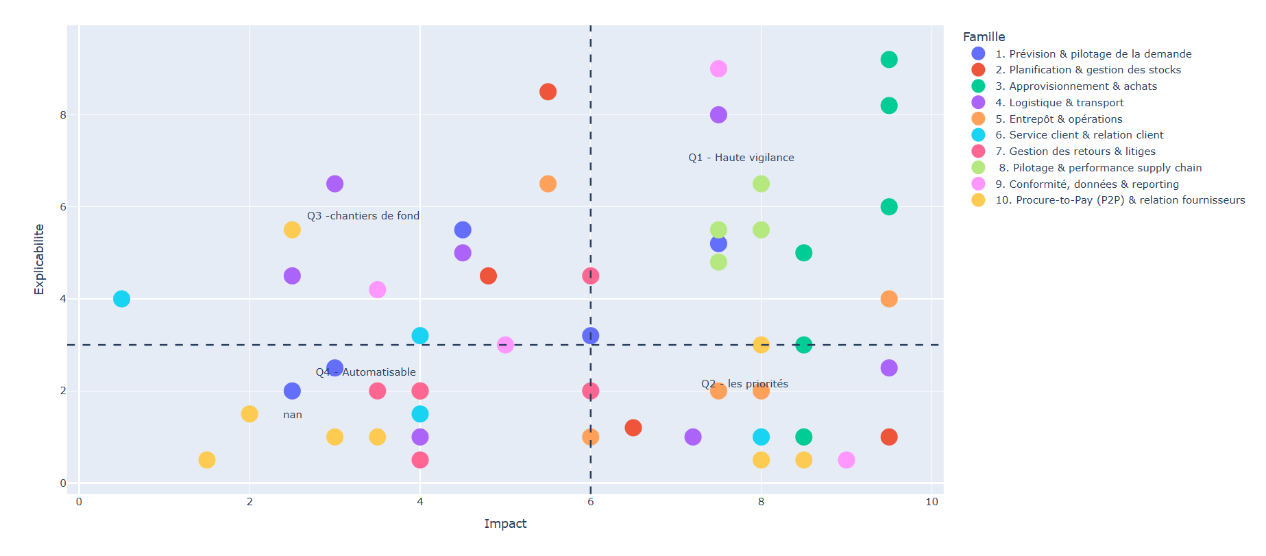 - Quadrant 1 — « les priorités » (fort impact, faible besoin d’explicabilité) C’est ici que l’IA peut être déployée rapidement, avec le moins de friction organisationnelle. Analyse des coûts de transport, détection d’anomalies sur factures, optimisation du parcours de picking… Ces cas d’usage génèrent de la valeur immédiate, sans que les équipes aient besoin d’en décortiquer chaque raisonnement.